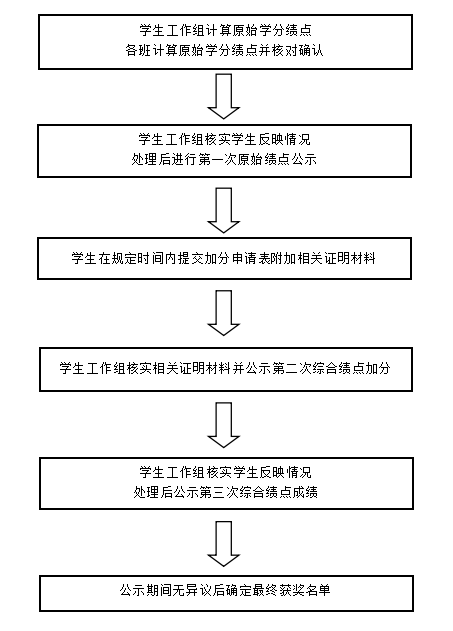 5、班级原始学分绩点的评定应程序为:由各班奖学金评定小组共同核算并签字,在班级同学中公示,无异议后上报班导,并上交学生工作组辅导员处。
