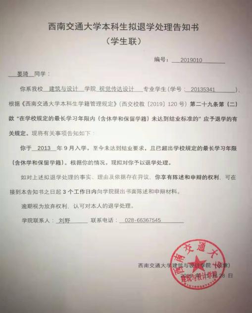 本科生学籍管理规定》第二十九条第(二)款 “在学校规定的最长学习年限内(含休学和保留学籍)未达到结业标准的” 应予退学的有关规定,拟对下列同学进行退学处理,因学院无法与本人取得联系,用其他方式也无法送达,特发布此公告,具体内容见附件。自本公告发出之日起满10日即视为送达,如果对上述拟退学处理有异议,可在公告期满3个工作日内向学院进行陈述和申辩。