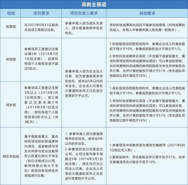 1.参赛组别和对象:创意组项目的负责人须为海外全日制在校生。初创组、成长组项目的负责人须为海外全日制在校生,或毕业5年以内的海外全日制毕业生。