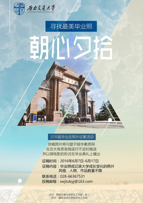 学生工作处主办,建筑与设计学院学生会承办的“朝心夕拾”2016届毕业生照片征集活动即将拉开帷幕,用相机定格下大学四年的回忆,用毕业照来记录你岁月里的青葱和美好。