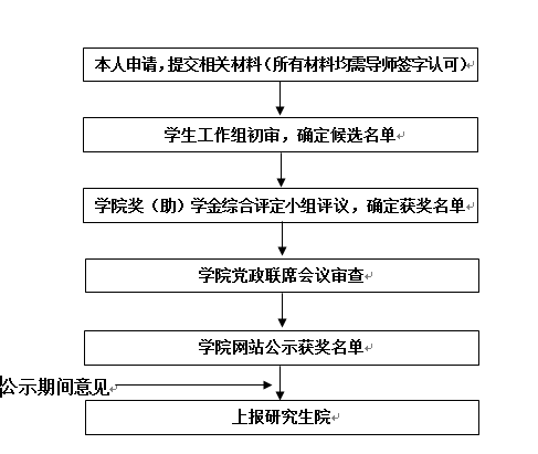 凡符合评奖条件的研究生,可在研究生学业奖学金评定开始之后(以学院通知为准),在规定时间内向学院提交书面申请,将申请材料交到院学生工作组。所有申请材料均需导师签字认可确认,且必须在规定时间内一次性提交完,逾期不接受任何修改和补交。