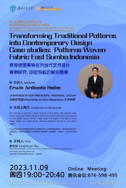 美术系国际艺术交流与美育分享活动、美术学科建设&教学研究系列讲座“将传统图案转化为当代艺术设计——案例研究:印尼东松巴梭纺织图案”,在印度尼西亚Universitas Kristen Maranatha大学的讲师Erwin Ardianto Halim充满热情的讲中拉开帷幕。此次讲座以线上分享的形式在腾讯会议展开,由蘑菇视频