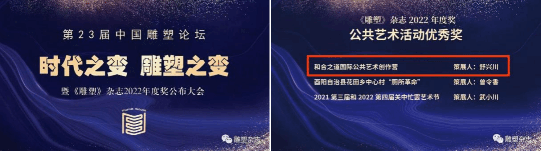 美术系主任舒兴川副教授发起、总策划的西南地区第一个国际标准化国际艺术创作营“和合之道”国际公共艺术创作营工作团队荣获“公共艺术活动优秀奖”。《雕塑》杂志 1995 年由中国工艺美术学会雕塑专业委员会创办,属于国家一级刊物,2003 年荣获中国新闻出版总署“国家期刊奖百种重点期刊”称号,是中国乃至亚洲唯一的雕塑专业刊物。《雕塑》杂志的年度奖评选,其宗旨就是运用业界唯一雕塑媒体的优势,通过回顾、梳理与评选,为推动雕塑艺术的创作、研究、市场和教学提供正能量。