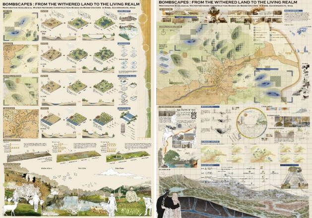 一等奖的作品《BOMBSCAPES:FROM THE WITHERED LAND TO THE LIVING REALM》聚焦伊拉克库尔德斯坦地区战后遗留弹坑问题,选取Halgurd-Sakran National Park区域作为研究对象,面对当地战争后土地破损、严重缺水、环境恶劣的条件,通过利用战后遗留弹坑构建区域水网系统,实现水资源的收集与利用,以此恢复多种生境进而与产业结合,将原本被战争侵蚀、残破不堪的场地重新赋予生机,实现当地生产、生活和生态环境的可持续发展。