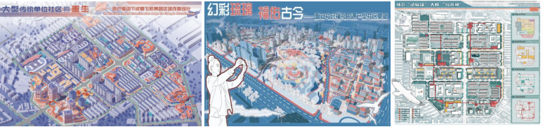 本科生获二等奖2项、三等奖1项、提名奖5项。二等奖作品围绕成都飞机集团区域改造和以韧性社区为导向的未来创新家园营造展开。三等奖作品选址成都锦江琉璃场片区,进行面向社会福祉的遗产型社区更新设计。