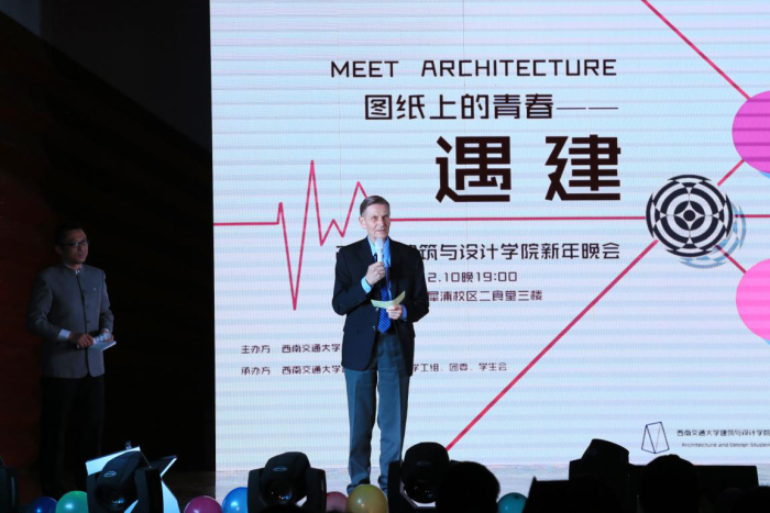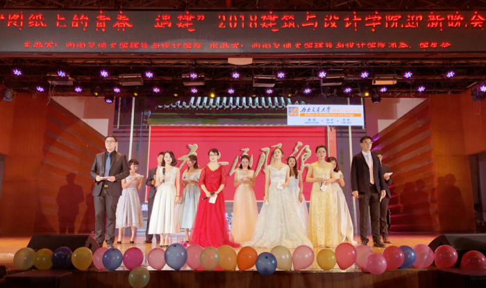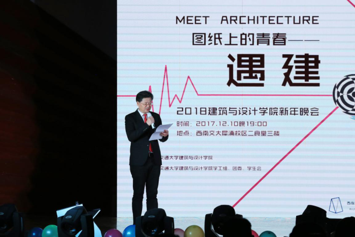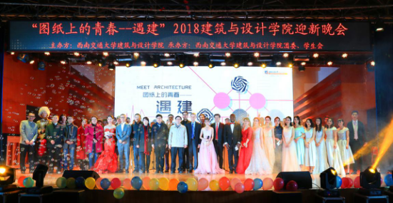 建筑与设计学院2018“图纸上的青春——遇建”迎新晚会于犀浦校区二食堂三楼隆重举行。建筑与设计学院党委书记沈中伟教授、院长Odgaard教授、全体院领导及各系领导、教师代表,各学院学生代表及我院全体新生应邀参加本次活动。