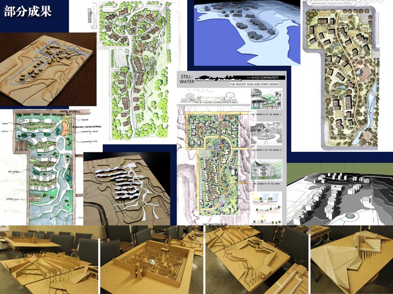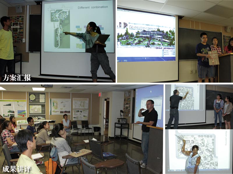 以斯蒂尔沃德市实际场地为对象,开展的Low Impact Development Co-Housing Design Project(住区低环境影响发展规划设计)是课程设计的核心环节。该项目以空间重建为手段追求社区复兴,力求降低建设活动对环境的影响,特别突出雨水收集利用策略的应用。Michael Holms教授和我方带队老师将夏令营同学依据专业和年级分为5组,共同指导同学们完成设计。课程进程中,全体同学在中美老师带领下,于7月19日在OSU透水材料车间进行了透水混凝土制作实习,参观了OSU Botanic花园。实地考察了雨水收集再利用、太阳能和风能利用等技术的示范应用。在一周的时间里,各组同学冒着近40°C的高温在现场踏勘;抓紧每一分钟在课内与老师充分交流;牺牲休息时间,密切配合协作,高质量地完成了场地分析、住区概念规划、社区中心概念建筑设计、LID策略与技术设计、模型制作等一系列设计内容。在时,各组同学饱满的工作量,精益求精的工作态度,得到了听取项目成果汇报OSU各位教授的交口称赞。在设计工作过程中,同学们重点学习实践了LID的设计理念和相应技术策略的应用,更利用跨专业、跨年级分组的机会,相互配合,取长补短,有效拓展了专业视野,提高了合作能力。完成LID设计项目后,Michael Holms教授又指导同学们完成了题为“3 Abjectives In 1 Acre”的主题开放性空间构成设计——即在1英亩的场地内,依据抽签获得的3个形容词,构建一个开放性空间。同学们分为8组,完成了概念解析、草图绘制、模型制作和汇报演示工作。同学们在短时间内完成的丰富成果和多组同学展现出的精巧构思,让历时3小时的成果演示充满惊喜,获得了到场各位教授的高度评价。