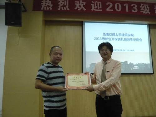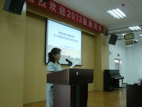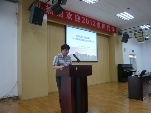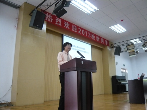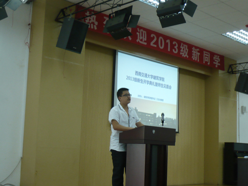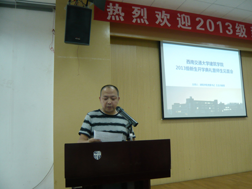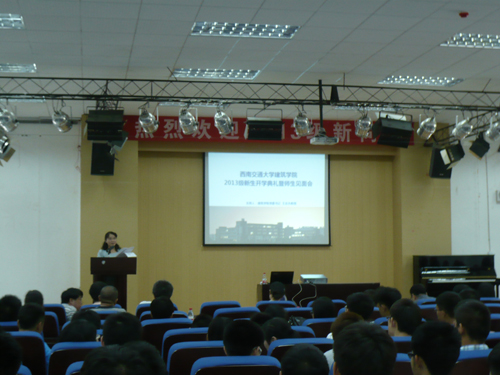 2013级新生开学典礼胜暨师生见面会在建筑馆学术报告厅召开。出席本次典礼的领导有学院党委王志杰书记、沈中伟院长等全体领导,各所负责人、班导师、辅导员、学生家长代表及全体新生参加了本次典礼,典礼由王志杰书记主持。