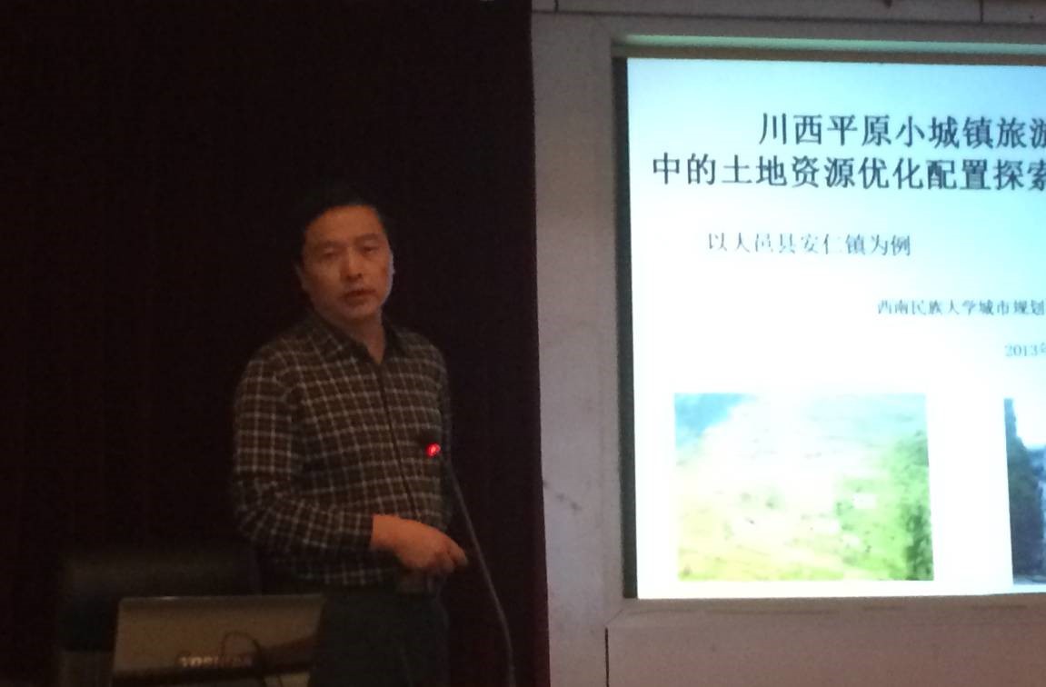 最后,赵兵教授以大邑县安仁镇为例围绕《川西平原旅游型小城镇发展过程中的土地资源优化配置探索》做了汇报,他主要从土地资源整合的视角来重新寻找旅游型小城镇发展的新方向。他认为:目前旅游型小城镇发展缺乏特色,同时缺乏对于土地资源的整合,导致目前旅游型小城镇千篇一律经济带动力较低。如何利用土地资源优化配置理论指导小城镇合理有序发展,达到帕累托最优,是目前平原地区土地供需矛盾加剧现状下应当着重考虑的问题。
