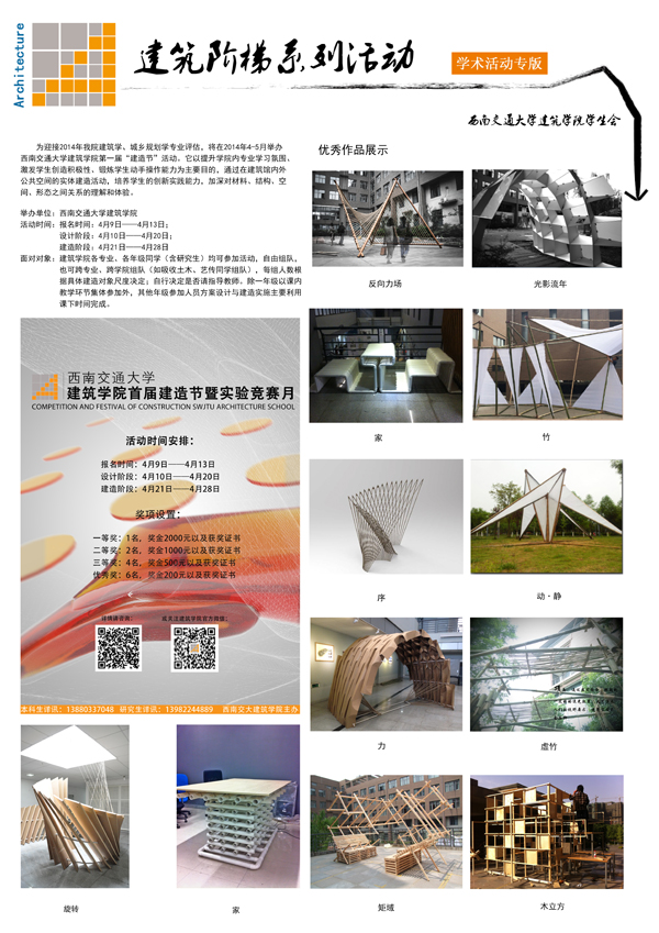 学生创新创造能力为目的,通过在建筑馆内外公共空间的实体建造活动,加深对材料、结构、空间、形态之间关系的理解和体验。提升学院内专业学习氛围,发挥学生创造积极性,提高学生的实践能力、锻炼学生动手操作能力,促进学生成长成才。