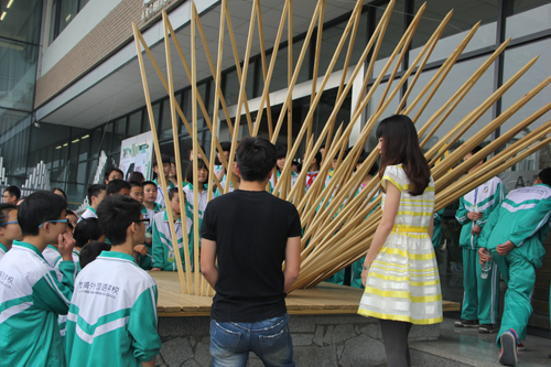 专业特色、本次建造节的重要意义及成果,让同学们领略到建筑学子的动人风采。我院的志愿者为参观师生详细介绍了各个参赛作品,包括方案设计、设计理念、材料选取、施工过程等。同时也为他们普及了相关的建筑知识,参观师生也兴趣盎然,不断在作品间探索穿行,感受充满创意的文化艺术氛围。