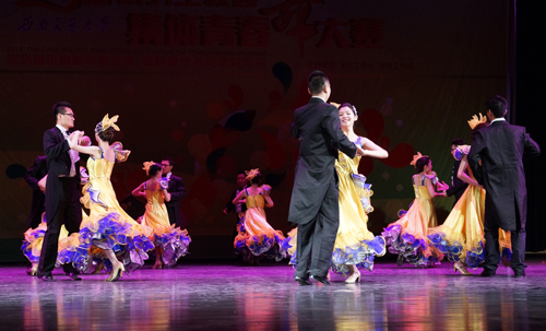 训练初期,因为学校安排的课程十分有限,同学们对一些基本动作仍然领悟不到位,对比赛所规定的圆舞曲节奏的把握也是力不从心,但是凭借团队强烈的荣誉感和自信心,逐渐从观看、模仿教学视频当中找到了突破口。为避免舞蹈动作出现错误,同学们便相互监督,互相纠正。通过各班文艺委员以及参赛队中几位舞蹈爱好者的牵头,大家集思广益最终确定了参赛的华尔兹曲目,并配合着舞蹈音乐,来确定出最终组成舞蹈的分解动作,按照舞曲基本节奏旋转打圈,动作轻快、优美,情绪热烈、欢快。华尔兹舞步具有明显的升降动作,加上轻柔灵巧的倾斜、摆荡、反身和旋转动作以及各种优美的造型,使其具有既庄重典雅、舒展大方、又华丽多姿。