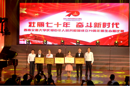 “壮丽七十年 奋斗新时代”庆祝中华人民共和国成立七十周年师生合唱比赛在九里校区大学生会堂隆重举行。学院部门工会认真组织,院领导班子成员携师生合唱团积极参加合唱比赛并获得二等奖的好成绩。