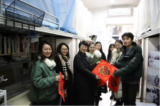 1月10日,为了切实做好学生寒假工作,学院党委副书记刘一杰,团委书记孔翔榆带领全体辅导员深入学生宿舍,了解学生寒假返乡情况,提醒尚在宿舍的同学用电安全及卫生,并叮嘱离校时注意关好门窗、电闸,提醒学生提高安全防范意识,路上注意安全。随后,老师们将写好的“福”字张贴在学生宿舍,为学生们送去最真切的祝福和关心,为宿舍园区增添了喜悦和欢腾。