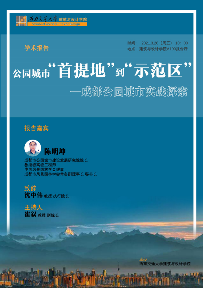 3月26日上午,成都市公园城市建设发展研究院院长,教授级高级工程师陈明坤来到我院A100学术报告厅,为我院师生带来了以“公园城市“首提地”到“示范区”——成都公园城市建设实践探索”为主题的精彩学术报告。报告由崔叙副院长主持,沈中伟院长、杨青娟副院长、风景园林系傅娅主任出席了学术报告会。学院师生近百人认真聆听了讲座,反响热烈。