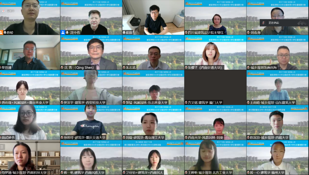 四位专家学者从不同的视角为学子们展示了在各自领域的探索和研究成果,拓宽了深造学习的视野,充分营造出学科交叉、相互启发的氛围,激发了学子们进一步攻读研究生的浓厚兴趣。同学们普遍认识到,建筑教学科研既包括了历史、文学、艺术知识,也深入到科技、材料、建造,并在新一代技术革命的冲击下孕育了无限可能。同时,营员们围绕“TOD站城一体化”、“新型共享服务”以及“公园城市”等主题与嘉宾展开了热烈的讨论与交流,专家们也对营员们提出的问题做出了专业的解答和深刻的启发。
