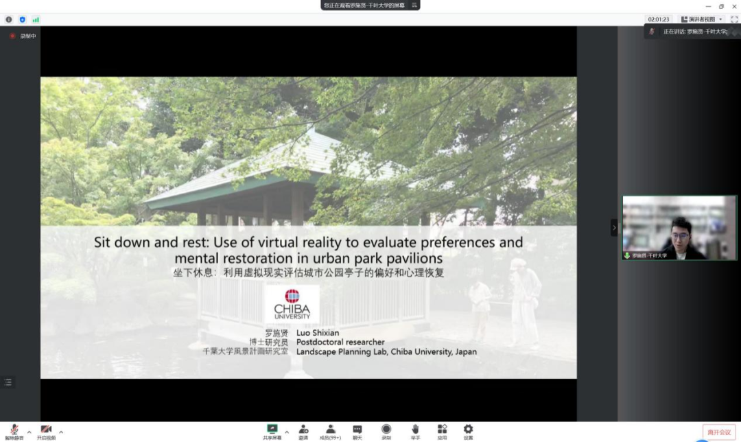来自日本千叶大学的罗施贤博士报告题目是:《“坐下休息:利用虚拟现实评估城市公园亭子的偏好和心理恢复”》。罗施贤博士选取城市公园中特定的休息环境——亭子作为研究对象,以“坐下休息:利用虚拟现实评估城市公园亭子的偏好和心理恢复”为题作了专业的学术报告,报告从背景、研究方法、结果和讨论四个部分展开,以亭子为切入点直接测量其恢复性和偏好,通过使用VR进行恢复性评估,探讨参与者如何感知不同的环境恢复性品质。报告对休憩空间的环境设计有一定的启发,并且基于VR的恢复性体验也有助于应对越来越多的公共健康挑战,以及使用VR远程访问类似公园亭子这些休息环境也为应对各种限制带来的挑战的提供一种新的思路。