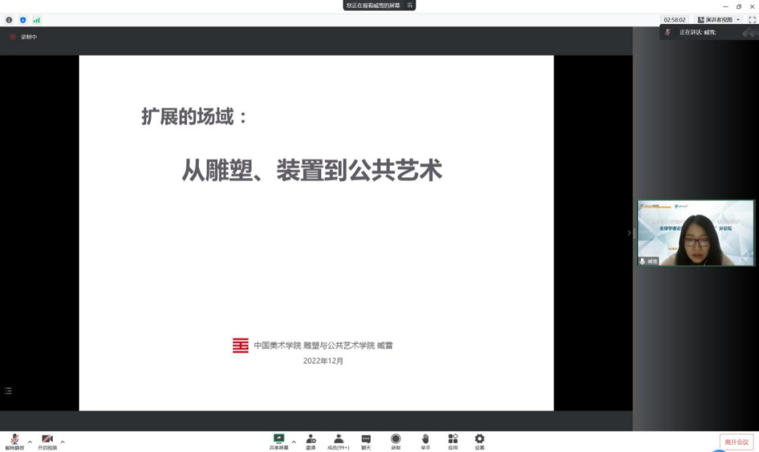 来自中国美术学院的博士臧雪报告题目是《扩展的场域—从雕塑、装置到公共艺术》,臧雪博士介绍了她最近所参与完成的艺术装置的作品,主要包括一个公共艺术的综合体——上海世博会浙江馆、一个地铁站——杭州地铁1号线婺江路站、一个机场公共艺术计划——行李箱的故事、千岛湖国际光影艺术双年展、一个空间艺术课题等。