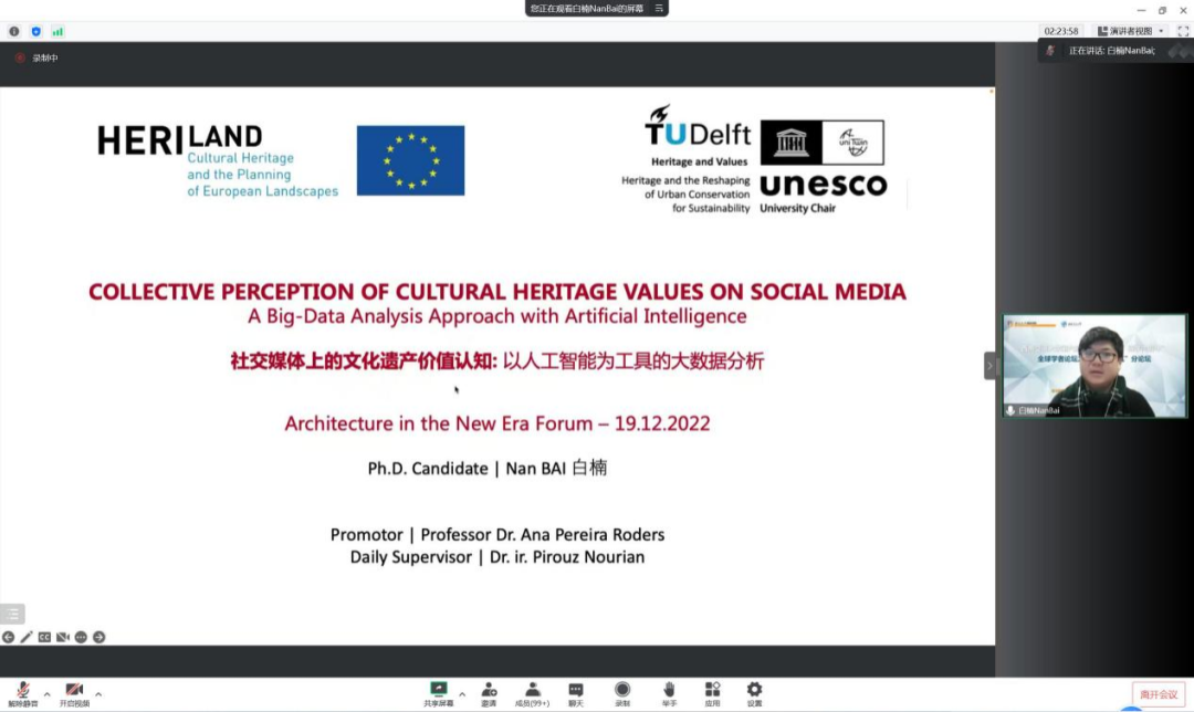 来自荷兰代尔夫特理工大学的白楠博士报告题目是《社交媒体上的文化遗产认知——以人工智能为工具的大数据分析》,白楠博士从文化遗产认知角度出发,以社交媒体上的标签信息为切入点,先是建立起关于文化遗产价值认识包容性的研究框架,再通过使用人工智能工具对标签信息进行分析,并且根据标签得到的信息进行多模态机器学习。报告是采用人工智能的把一个新的研究技术应用到一个传统的研究问题上,为未来文化遗产认知的研究提供了一些新思路、新方法。