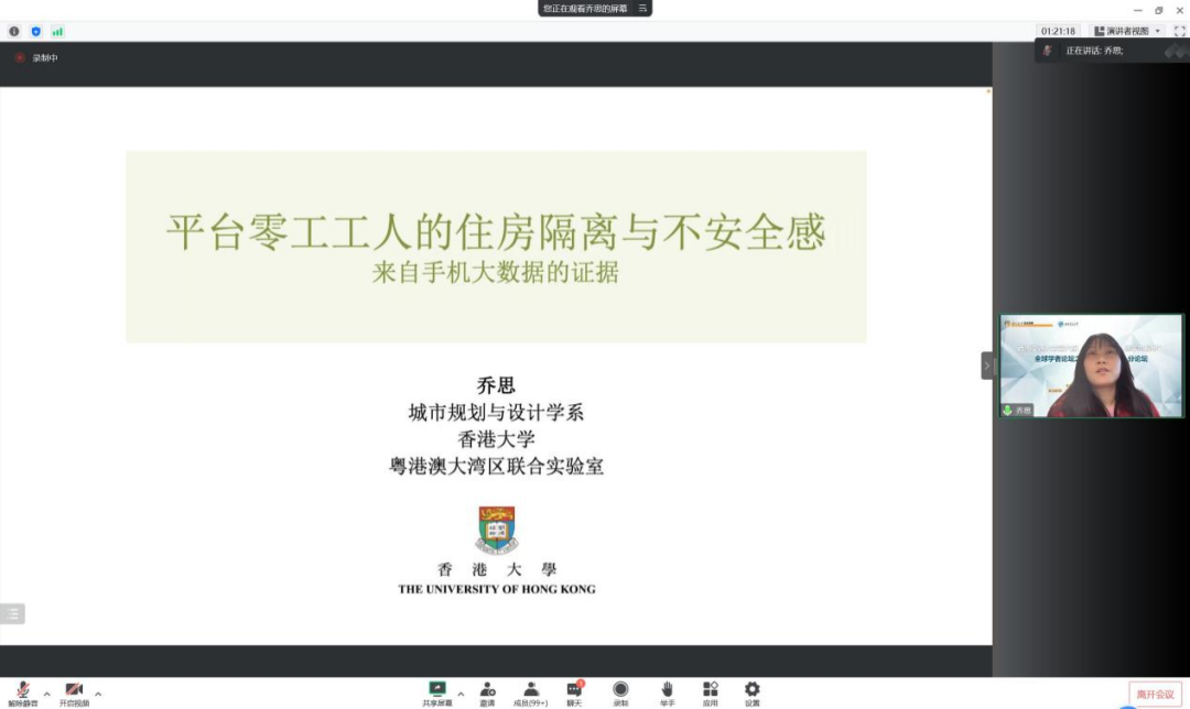 来自香港大学的乔思博士报告主题是《平台零工工人的住房隔离与不安全感:来自手机大数据的证据》,乔思博士关注了平台零工群体的巨大数量和在劳动保护等方面的弱势地位,以网约车司机为例研究零工工人的群体特征和未被察觉的社会联系。研究以将流动的网约车司机与地方联系起来为框架,调查网约车司机居住地点的空间结构以及居住选择对网约车司机工作偏好的影响。以成都为为例研究平台零工工人的社会人口特征与居住选择关联。研究得出了四项经验证据和多项理论贡献。
