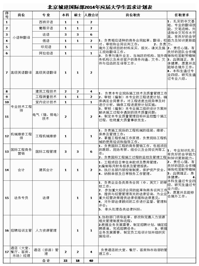 【招聘信息】北京城建集团国际工程总承包部2014年应届大学生 校园招聘启事