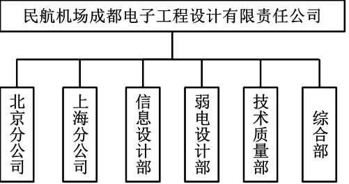 民航机场成都电子工程设计有限责任公司包括北京分公司、上海分公司、信息设计部、弱电设计部、质量控制部和综合部等6个二级部门。公司组织机构框图如下图所示。