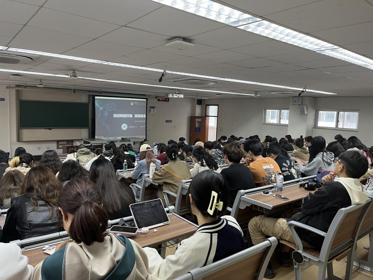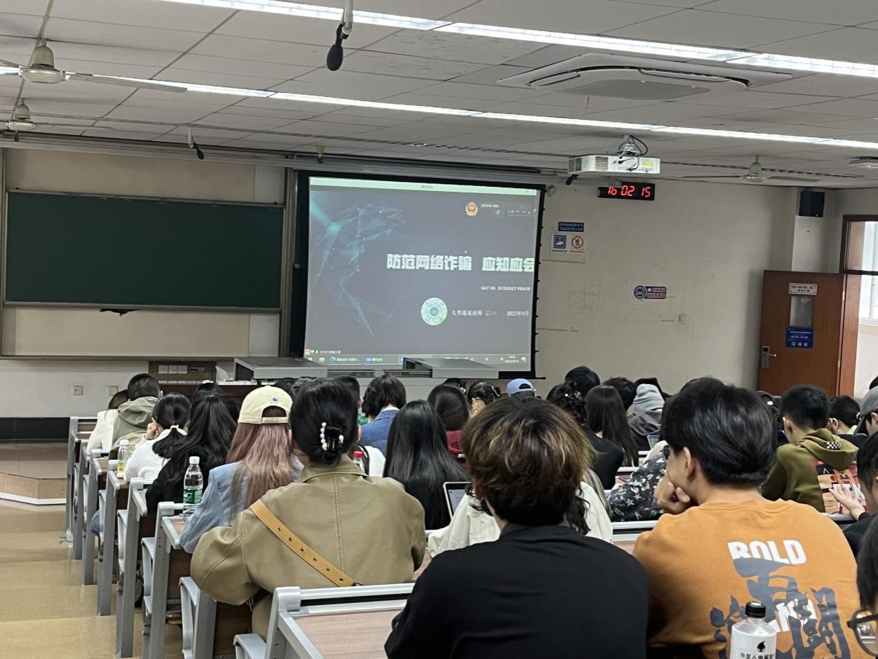 在本次活动中,民警播放了贴近生活的反诈套路的相关视频并通过PPT向同学们介绍了一些常见的网络电信诈骗形式,主要包括扫描不明二维码、伪冒银行工作人员、网络聊天诱导等等,并且给出了防范诈骗的基本公式,即人物(无法准确确认其身份)+沟通工具(电话、网络、短信见不到真人)+要求(汇款、转账)=诈骗。此次活动旨在让同学们加深对诈骗手段及骗局的认识和理解,时刻提高警惕,以防被骗!
