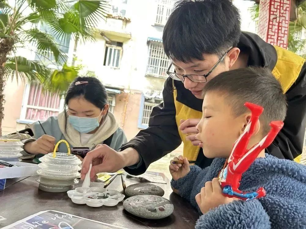 青年志愿者协会的大学生志愿者们将颜料、鹅卵石、调色盘、画笔等物料分配到每一张桌子上,现场吸引了来往居民们的驻足体验,有三岁左右的小朋友,也有年过花甲的老人。在志愿者们的指导下大家拿起了画笔,在石头上勾勒出脑海中的幸福图案,有绘有卡通画、山水画、写意画的,还有随形画、工笔画等,风格迥异 、各具风格。亲手将平平无奇的石头制作成独一无二的作品。每位活动参与者都感到非常自豪、有成就感,并相互展示交流并拍照留念。现场还挖掘到了一名“宝藏”院落达人摄影师刘铎琪定格这一美好瞬间。