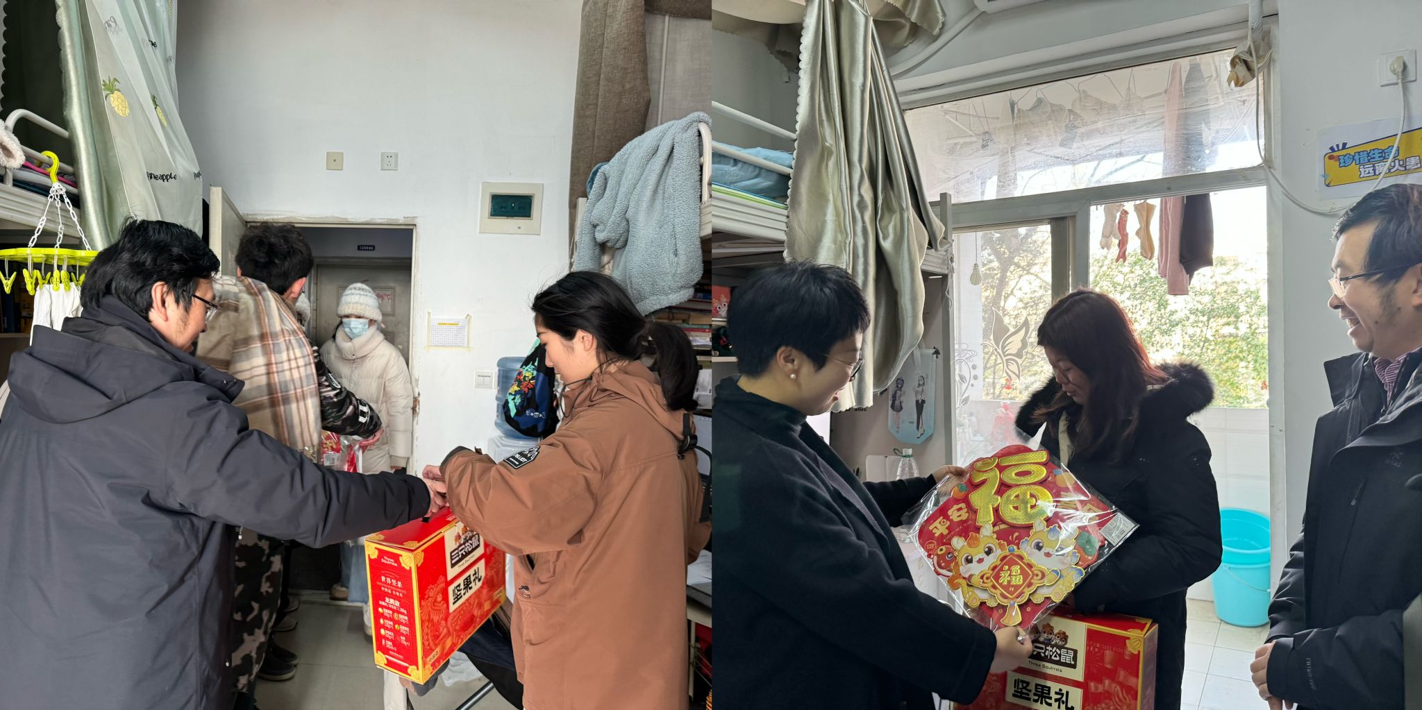 学院党委书记胡伟和副书记刘一杰为同学们送来了春节大礼包,学院也将根据留校学生的实际情况,给予相应的关怀与帮助,努力做到给同学们营造家的温馨氛围。