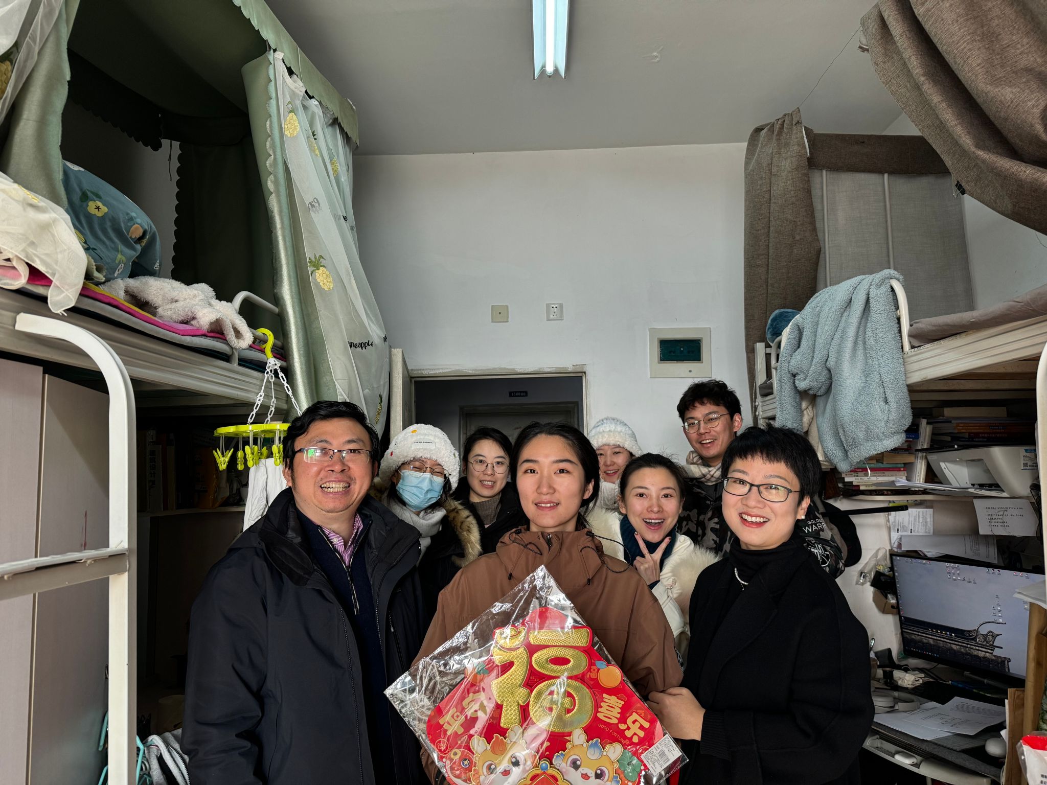 老师们集体深入学生宿舍,对留校同学表达了亲切问候,并向同学们致以新春的祝福。慰问过程中,蘑菇视频