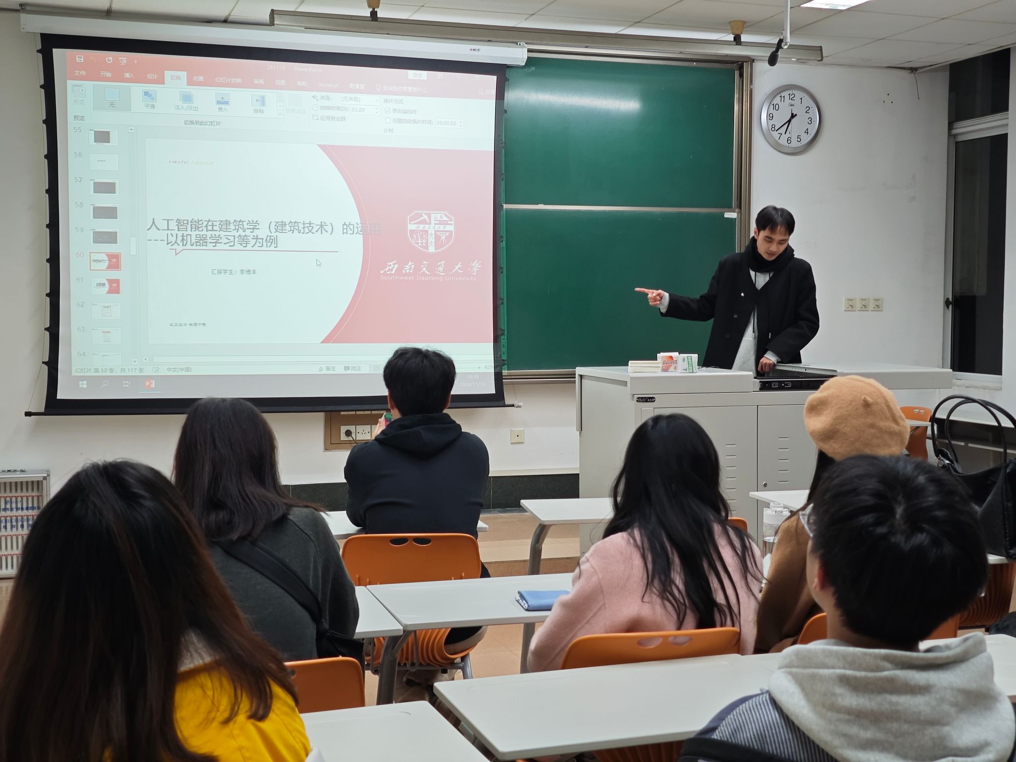九里校区4教4221教室,结合研究生“红路”理论学讲团开展“赓续奋斗精神,厚植青年担当”主题宣讲活动,开展了本班的团日活动及学术素养和科研能力提升的班会交流分享。本次班会涵盖了四个重要主题:新时代青年的责任与担当、科研工具的分享以及人工智能在建筑技术中的应用。旨在增强研究生的爱国情怀,培养科学精神以及良好的学术道德风尚,同时,为促进班级积极学习氛围,以班长为首的几名班委依次分享了一些科研工具以及前沿科研技术,从而鼓励同学互相交流学习,寻找更多科研创新点。