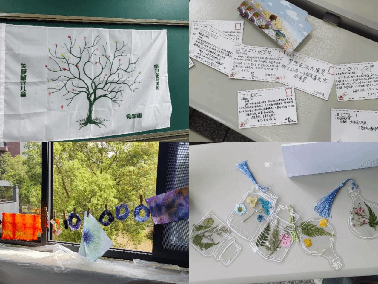 活动现场分为手工艺品制作区与明信片书写区。在志愿者的引导下,参与者们体验了扎染、漆扇、干花书签等传统工艺品的制作。扎染区中,白棉布通过折叠与染色焕发独特纹样;漆扇区里,同学们赋予素扇灵动生机;干花书签制作则让自然之美定格于方寸之间。此外,许多同学在明信片上写下暖心寄语,鼓励山区儿童勇敢追梦。