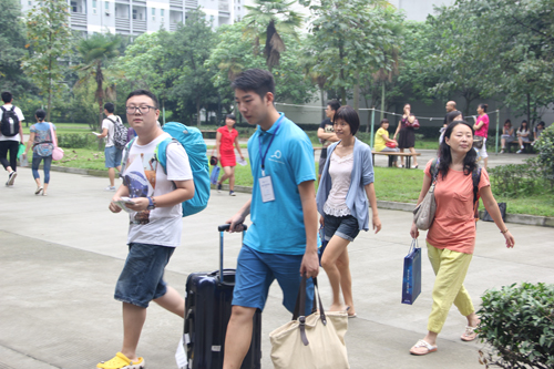 志愿者们为家长和新生搬运行李
