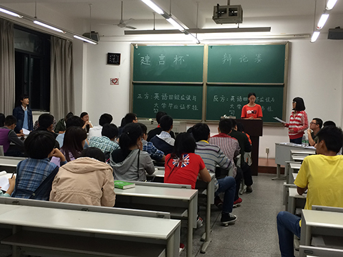 首先是来自风景园林班与建筑二班的对抗,持“英语四级应该与大学毕业证挂钩”的正方——风景园林班首先发言。正方一辩语气沉稳,逻辑清晰。与此同时,反方辩手也紧张地在纸张上打稿,为己方的反击陈述做准备。接下来的质询环节和申论环节,正反双方采取分点论证的策略,流利言语,逻辑严密,几轮交锋都各得其势。整场比赛的高潮也在小结环节达到巅峰。正方三辩从小处入手,质询反方数据来源,所谓“辩者诡道”,面对对方连珠发问,反方没有做出相应准备,略有弱势凸显。但之后反方奋起直追,反方二辩神情生动,情绪激昂,投入其中,渐渐扳回劣势局面。在辩论赛最后的自由时间中,全场互动,气氛热烈。最终,反方以三比二的微弱优势获得胜利。全场最佳辩手由风景园林班的胡嘉义获得。整场辩论环节张舒有度,感染力强,同学们参与积极,反响热烈。