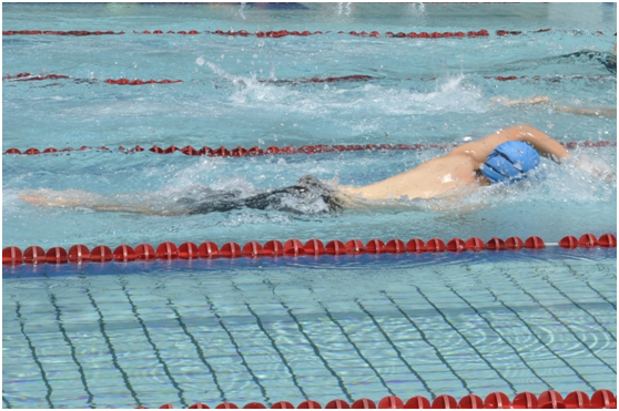 (图为杨硕同学在50m自由泳比赛中)