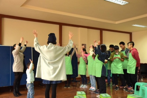早上,志愿者们早早的来到了九里校区工会俱乐部进行现场布置,大家把板凳依次摆放好,又给小朋友们铺上了垫子,可以让小朋友和家长一起坐着看书,大家把现场布置好后,石头妈咪(九里校区的志愿者),教志愿者们两套手指操,并安排了故事小屋的活动流程,把任务分配给了各位志愿者,在教志愿者的同时石头也按耐不住,和妈妈一起为志愿者们示范。