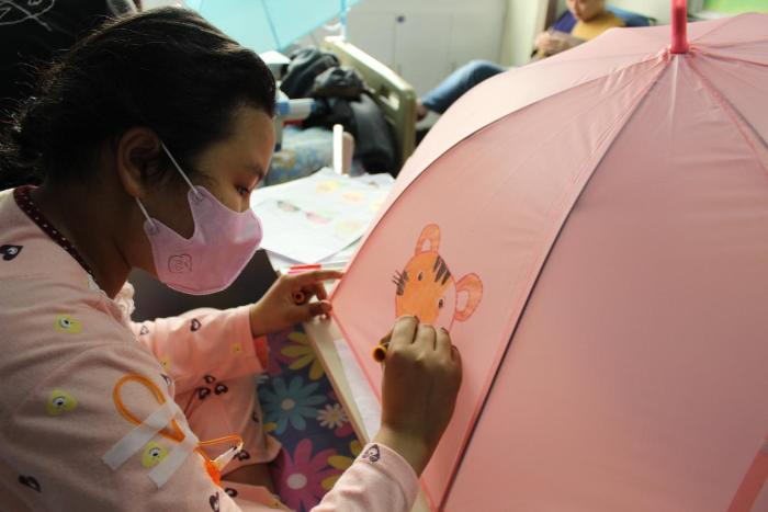 建筑青协的志愿者们与小朋友们搭档,共同构思涂鸦图案,用防水画材在彩色的小雨伞上完成小兔子、加菲猫、小公主、彩虹等作品。儿童患者对该活动表现出了极高的期待,有的孩子还特地穿上新衣服迎接志愿者们的到来。他们乐观坚强,用稚嫩的小手描绘着心中的偶像和对美好未来的向往。这些雨伞不仅是遮风避雨的工具,更是他们展现自我,放飞希望的理想画板。虽然暂时患病,带着口罩,但依然可以从眉眼间看到他们对健康和阳光的憧憬。