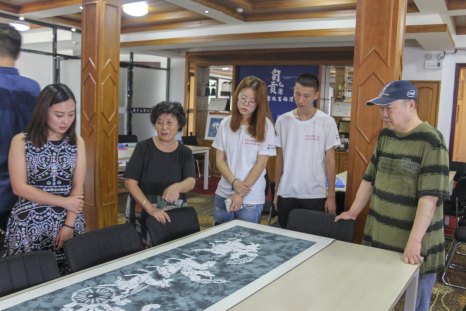最后我院教授缪根生与张女士交流彼此的扎染作品并共同探讨未来自贡扎染的发展。缪根生老师是我院“纤维艺术”课程的领军人,扎染经验相当丰富。他提出,我院学生在创意方面优于传统手工艺人,但技术尚待提高,学院应开设此类艺术基地,不仅能学到更多技法知识,也能培养系一列扎染艺术创新人才。同时,希望自贡扎染厂不断弘扬优秀传统中国文化,加深校企合作,积极响应国家号召,为非遗建设美丽乡村做出重要贡献。