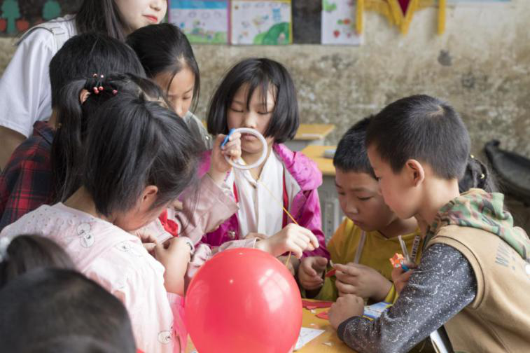在本次志愿活动中我们为孩子们带去了美术教材和精美的手工工具,以及相应的彩色画笔、油画棒、气球等学习娱乐工具。活动期间,我们从与自身专业相关的艺术方面,为孩子们讲述日常生活中的美,我们从一花一木讲起,与他们共同发现存在于我们身边的美,在孩子们的幼小心灵埋下向往美好的种子。此外,我们还将孩子们分成不同的小组,给每个组分发了一个精美的手工制作任务,并要求孩子们在没有老师带领的前提下,通过小组内合作的方式去完成手工制作。制作的过程并不是一帆风顺,每个小组都遇到了或大或小的问题,这时我们就引导孩子们去独立的思考、大胆尝试,最终大家都完成了手工的制作。