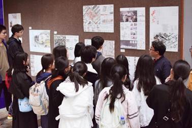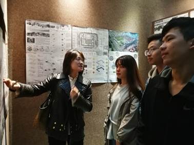 在中庭展区,付飞老师就华中科技大学作品《街内·街外》为例,细致地讲解点评了联展图纸中优缺点以及值得学习的地方,并就图纸的排版以及视觉效果问题作出了细致到位的点评,点评其作品层次丰富、内容引人入胜。最后教导同学们在制作图纸的时候要注意整体效果,同学们受益匪浅。