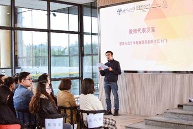 接着,我院教师代表付飞进行了发言。付飞老师先回顾了建筑学学科办学90年来的发展历程,同时给予了本次高校联展极高的肯定,并从教师角度分析阐述了本次联展活动对于学院发展的积极推动以及对学院学生所产生的深远影响与启发;同时也表达了对每一所参展学校的感谢和对今后持续合作的期望。在场师生都真切地感受到了学院对本次活动的重视以及对未来积极发展的希望。