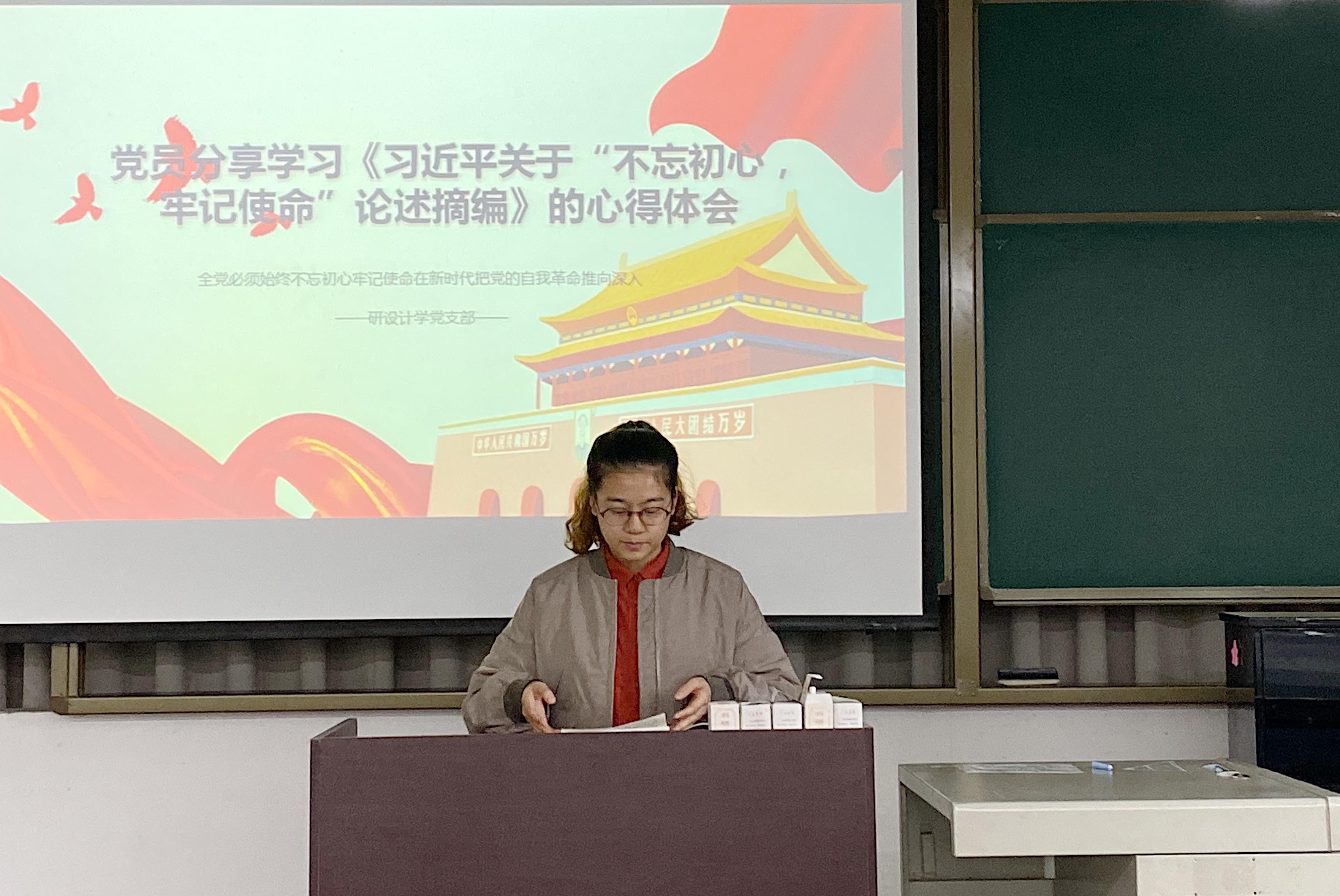 2019年11月7日下午,建筑与设计学院研设计学党支部在建筑与设计学院X8215教室开展了“不忘初心、牢记使命”主题教育。会议内容围绕第二批主题教育“不忘初心,牢记使命”的深刻内涵作为专题开展学习。首先,研设计学支部杨智荣同志主持会议并带领全体党员展开学习,研设计学党支部17级党员王瑞同志分享学习《习近平关于“不忘初心,牢记使命”论述摘编》的心得体会。接着,研设计学支部各党员同志共同学习英雄事例,观看影片《感动中国人物—黄大年》,最后,学院党委委员舒兴川老师对本次研设计学党支部生活会议作总结建议。