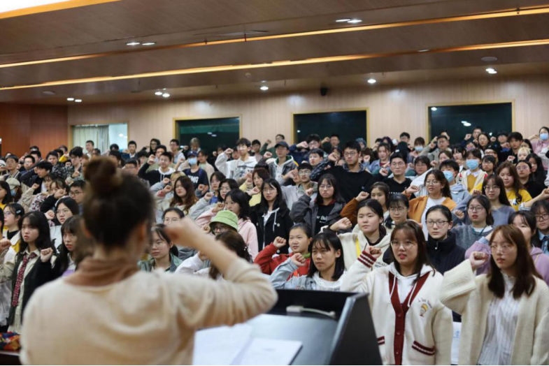当天下午四点,同学们来到了校图书馆第二报告厅,准备学习大学生涯的第一节团课知识。本次团课由2020级建筑与设计学院辅导员孔翔榆和王文静共同主持,建筑与设计学院2020级全体新生参与本次团课学习。