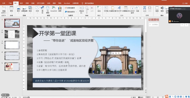 会议以“带你走进”‘成渝地区双经济圈’为主题,辅以团歌、《团团致四川学子的一封信》、《团团说唱节约美德》、青年大学习网上主题团课等相关内容以及分享交流等环节。