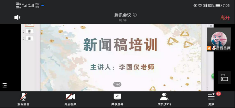 建筑与设计学院团学中心通过腾讯会议平台举办了“校园新闻稿写作”线上培训活动。本次培训由团学中心主任吕薇主持,建筑与设计学院辅导员李国仪老师担任主讲人,共计191人参与此次培训学习。