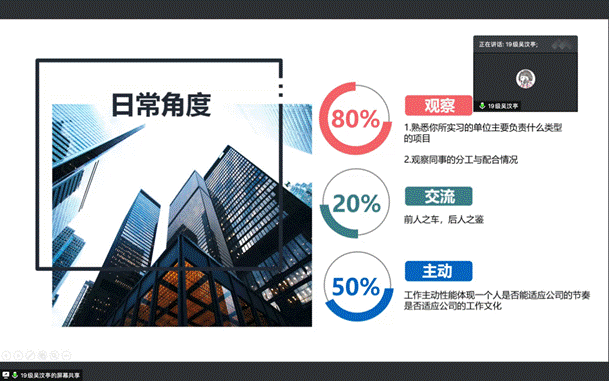 为鼓励和支持我校大学生积极探索生涯发展道路,通过就业实践和能力训练,不断提升就业竞争力和职业成熟度,2020年11月23日晚上7点,我院开展了研究生求职实习分享会,分享会由2019级城乡规划班吴汶亭、2018级建筑专硕2班陶婧两位学姐主讲,所有2020级建筑类研究生参加了本次分享会。