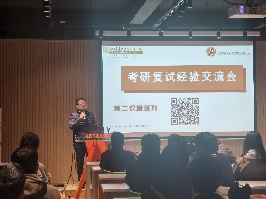 首先由院长助理刘春尧老师为我们讲解复试面试相关的情况与面试技巧,分析了面试的根本目的——考察学生的整体状况。“在外语面试中保持良好心态,尽己所能的展示自己”,刘春尧老师的一番讲话让同学们对考研复试面试有了更清晰的方向。接下来由建筑系系主任张樱子老师列举了一些事例,她认为面试是一种交流,在面试时对问题需有自己的见解与看法,保持自信。两位老师讲解完后,由2020级三位学长学姐为我们答疑解惑。给同学们分享了面试的经验。讲解了有关线上复试的注意事项和与面试不同的问题,如网络是否良好、设备是否稳定等。