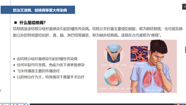 其次,会议提到常见的传染病——结核病。结核病是慢性传染病,据2020年世界卫生组发布报告,估计2019年全球新发现结核病患者近1000万例,死亡患者约141万例。2021324日是第二十六个“世界防治结核病日”,主题是“终结结核流行,自由健康呼吸”。为此,班长呼吁同学们在日常生活中要保持良好的生活习惯、加强锻炼、提高免疫力、避免与传染性结核病患者接触。
