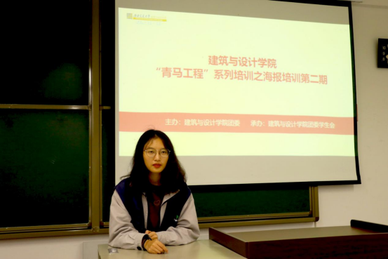 2021年10月23日,为了提高同学们使用软件技巧的能力,丰富同学们的课余生活,建筑与设计学院团委学生会在X8323为新成员们开展了“青马工程”系列培训之海报制作第二期培训。此次培训由学生会宣传部部长罗熳蕾主持并进行培训。