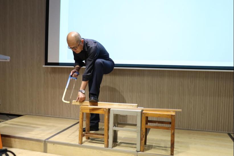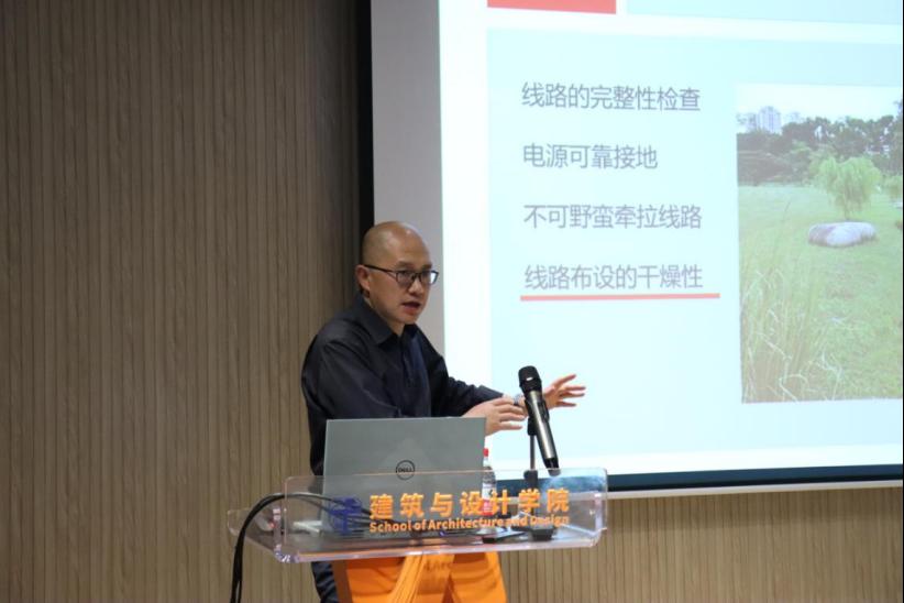 会上,韩君伟老师首先强调了正确用电的重要性,并一一讲解了用电的正确操作及错误示范。对于电钻、木锯等具有一定危险性的工具,韩老师结合往届同学的错误操作行为,以案说法,悉心讲解,现场操作,使同学们能够更直观的理解与感受。